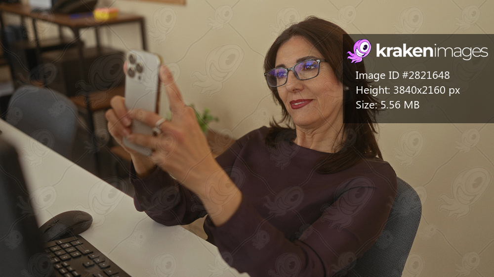 Middle aged woman wearing glasses leans back and holds smartphone above office desk next to computer keyboard and mouse; calm focus.