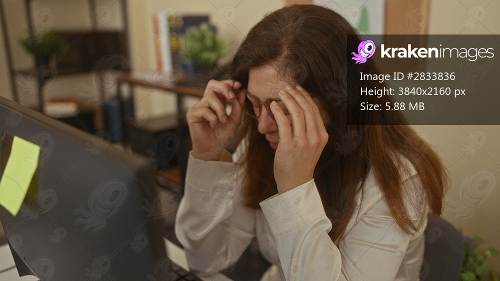 Middle aged woman wearing glasses sitting at computer resting hand on cheek by desk in office; fatigue.