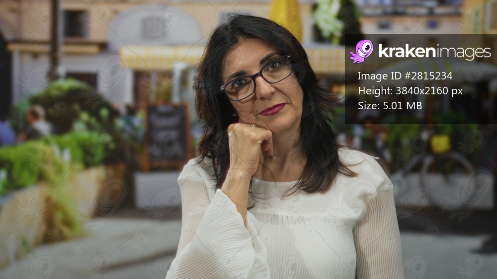 Middle aged woman wearing glasses and white blouse hand on chin gesture in busy city street cafe with bicycles visible; introspection contemplation.