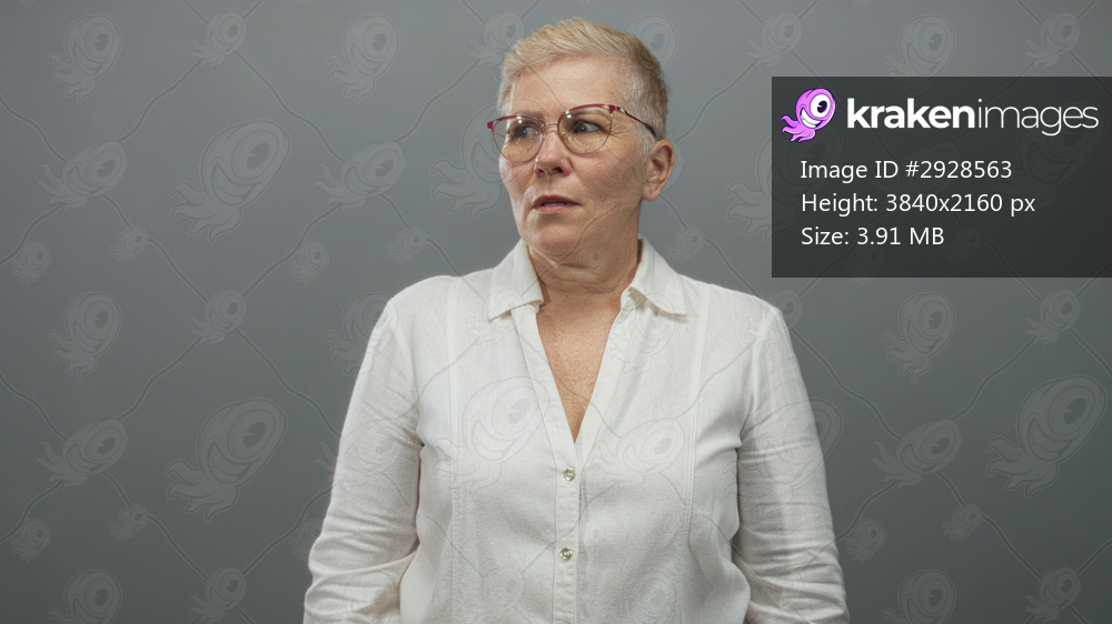 Middle aged woman wearing glasses and white shirt looking to the side with mouth slightly open in gray studio; quiet concern.