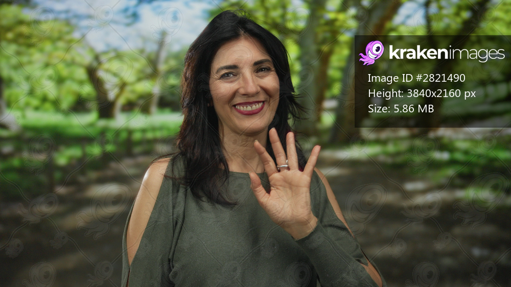 Middle aged woman wearing green top waves bare hand in sunlit forest while smiling warmly; warm friendly greeting.