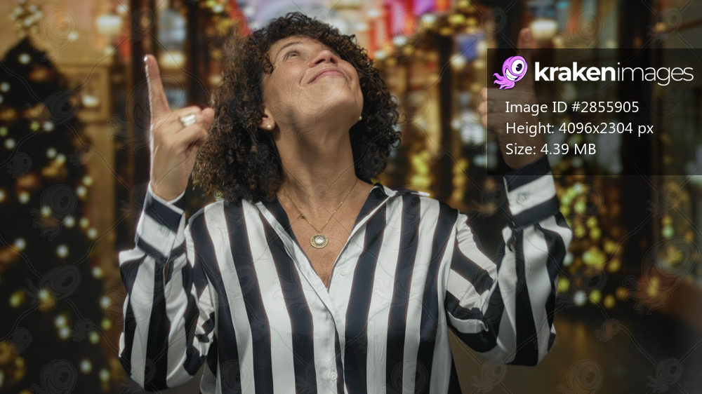 Middle aged woman wearing striped shirt pointing index fingers upward in crowded street; optimism.