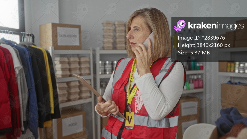 Middle aged woman wearing volunteer vest holds clipboard and talks on phone in building; compassion aid support.