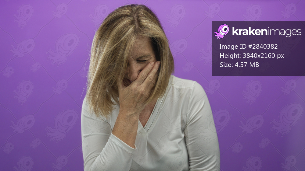 Middle-aged woman wearing white blouse covers mouth with hand on purple backdrop in studio; discomfort pain distress toothache.