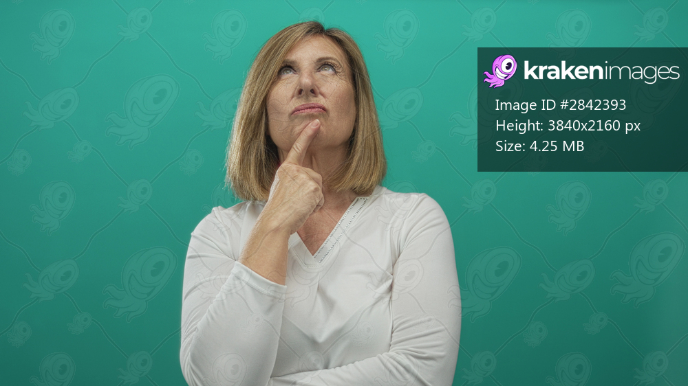 Middle-aged woman wearing white long sleeve shirt resting chin on finger and gazing upward against teal studio wall; thinking.