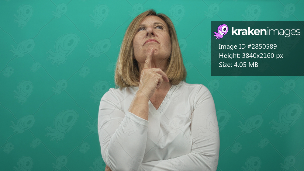Middle-aged woman wearing white long sleeve shirt resting chin on finger and gazing upward against teal studio wall; thinking.
