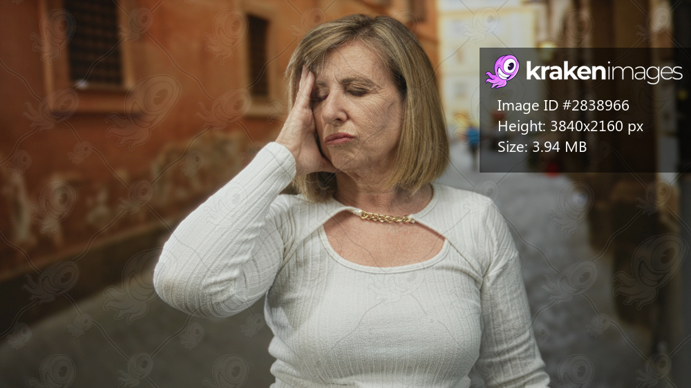 Middle aged woman wearing white sweater pressing head with hand in old town street; headache discomfort.