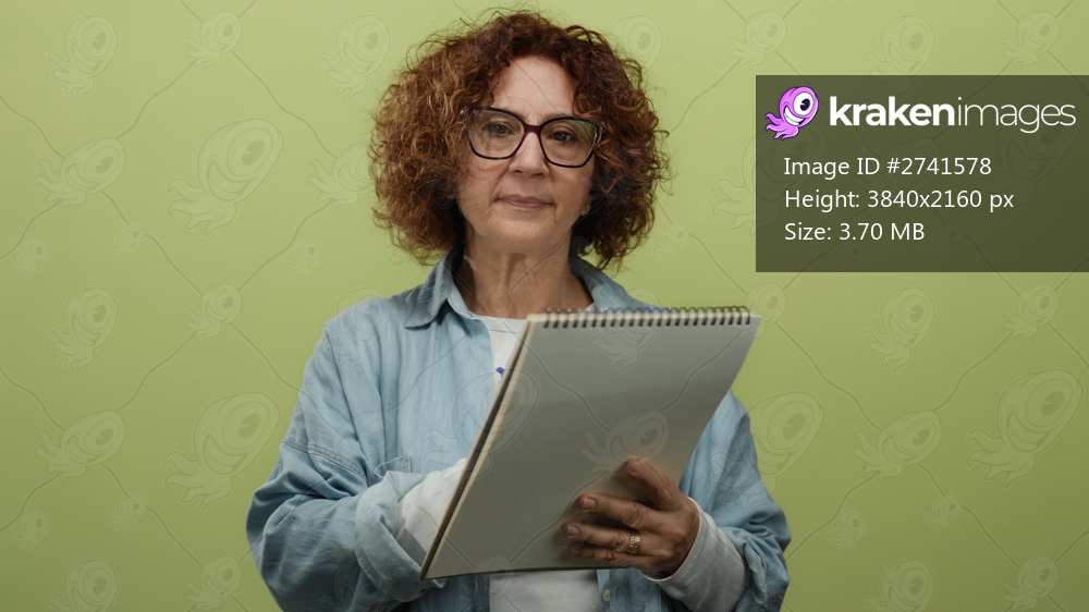 Middle-aged woman writing in notebook against isolated yellow background, wearing glasses and casual denim shirt.