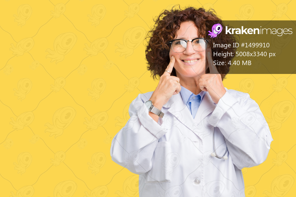 Middle ager senior doctor woman over isolated background Smiling with open mouth, fingers pointing and forcing cheerful smile