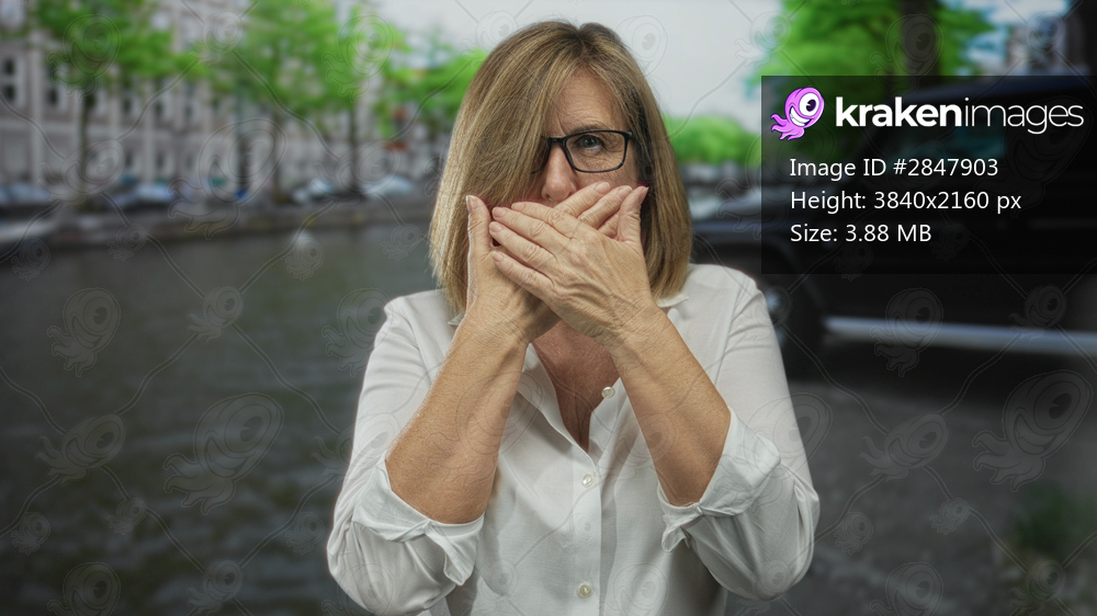 Middleage caucasian woman wears glasses and makes finger to lips for silence at canal street; secrecy.