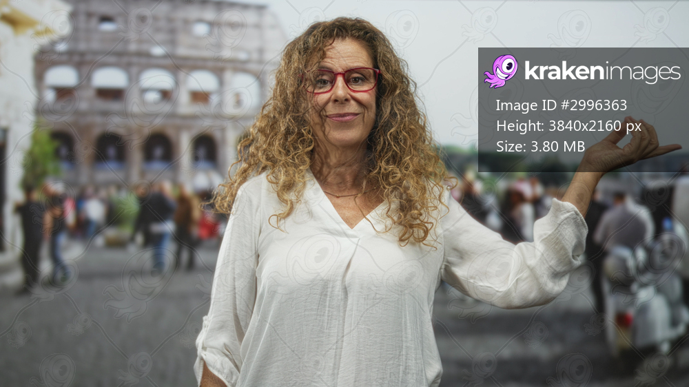 Middleage hispanic woman points finger and shows open palm toward colosseum on busy tourist street; travel curiosity playful.