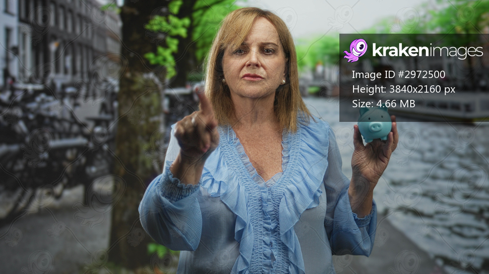Middleage woman points finger while holding blue piggy bank on a street by a canal; financial caution.