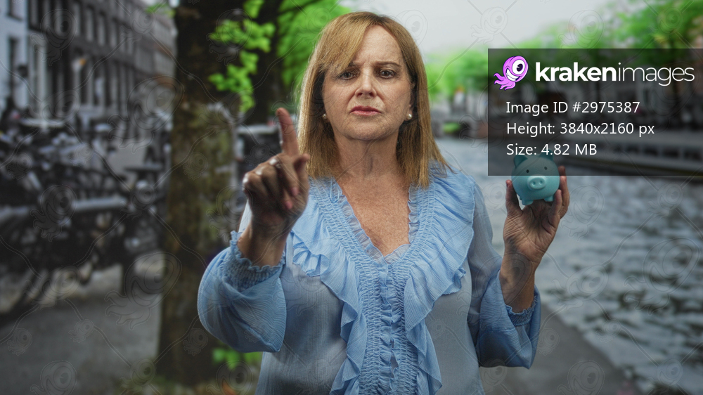 Middleage woman points finger while holding blue piggy bank on a street by a canal; financial caution.
