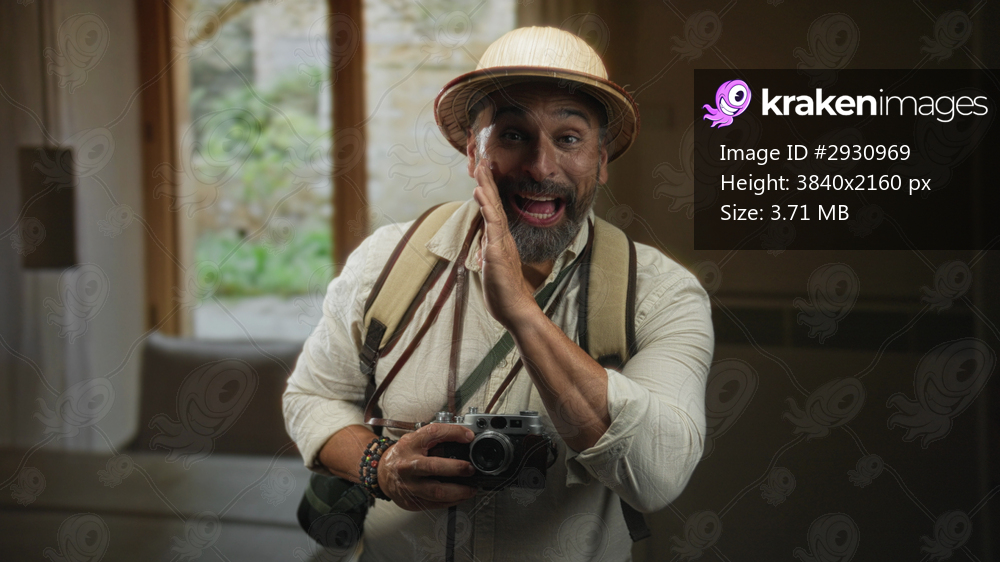 Middleaged bearded man wearing hat and backpack holds a camera and calls out with hand to mouth in a building; playful adventure.