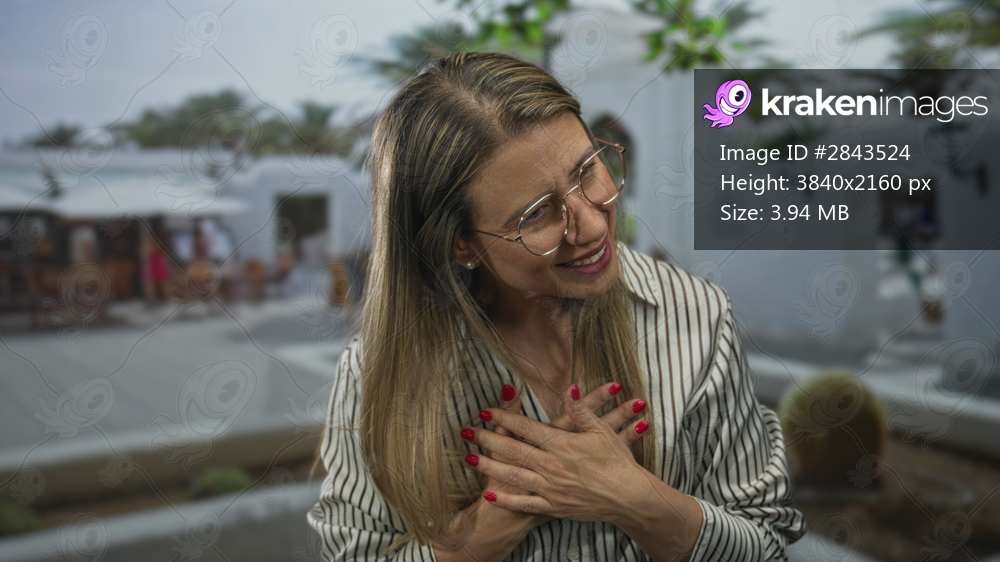 Middleaged blonde woman with glasses holding hands over chest on urban street; sincerity gratitude warmth.