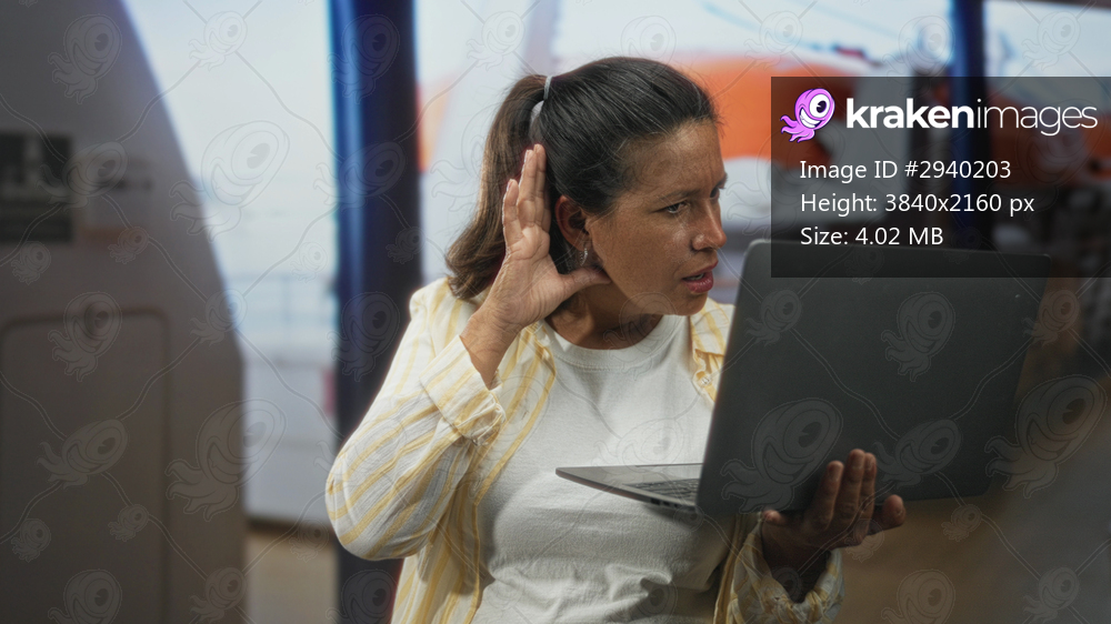 Middleaged brunette woman holding a laptop and cupping her ear to listen while studying the screen, ship lifeboat visible through a window in building; curiosity problem solving. - Kraken Images