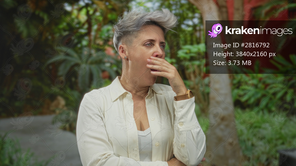 Middleaged caucasian woman yawns rubbing cheek in building surrounded by green foliage of indoor park under natural light; fatigue.