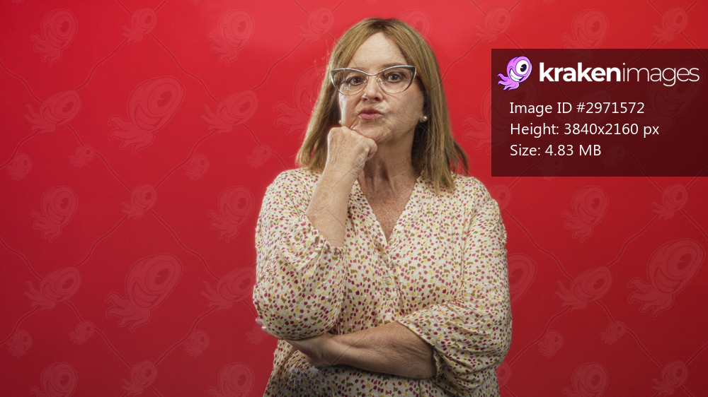 Middleaged hispanic woman with hand on chin and arms crossed, wearing floral blouse and cat eye glasses against red backdrop in studio; thoughtful reflection. - Kraken Images