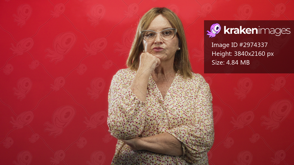Middleaged hispanic woman with hand on chin and arms crossed, wearing floral blouse and cat eye glasses against red backdrop in studio; thoughtful reflection. - Kraken Images