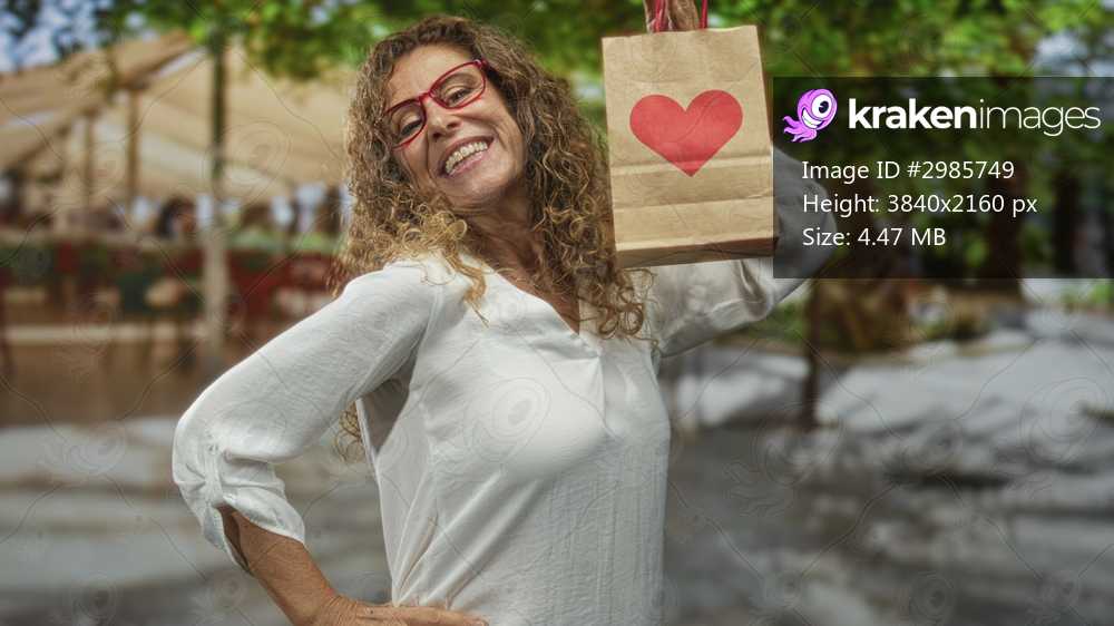 Middleaged hispanic woman holding paper gift bag with red heart, hand on hip smiling pose street; joy love giving.