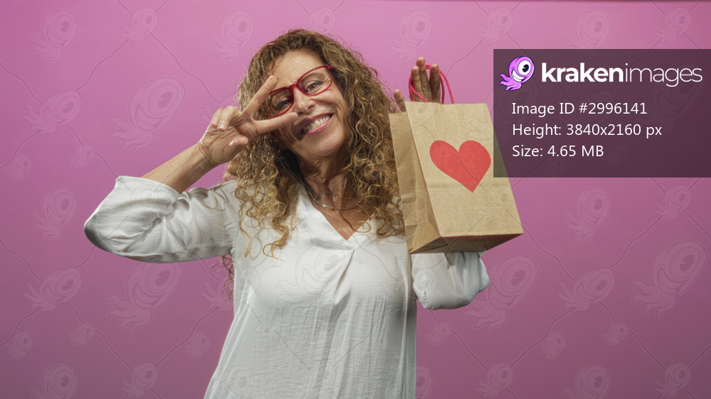 Middleaged hispanic woman smiling while holding a paper heart gift bag and showing a peace sign in a pink studio backdrop; joy love celebration.