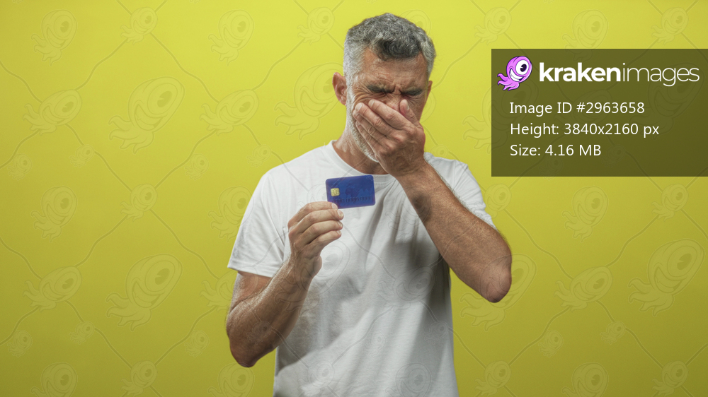 Middleaged man holding blue creditcard and covering his face with one hand in a studio yellow backdrop, showing card and hand gesture; financial anxiety. - Kraken Images