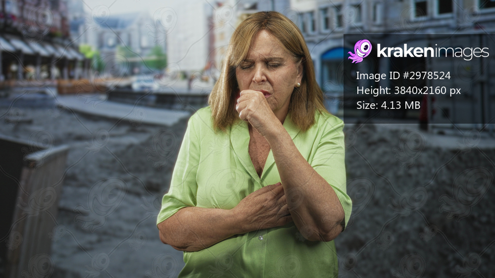 Middleaged woman coughing into fist and clutching chest, wearing green shirt and earring, on street; health concern.