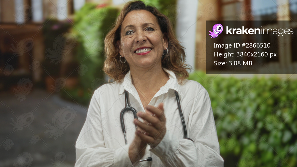 Middleaged woman doctor claps hands with stethoscope in front of building under bright morning sunlight; support.