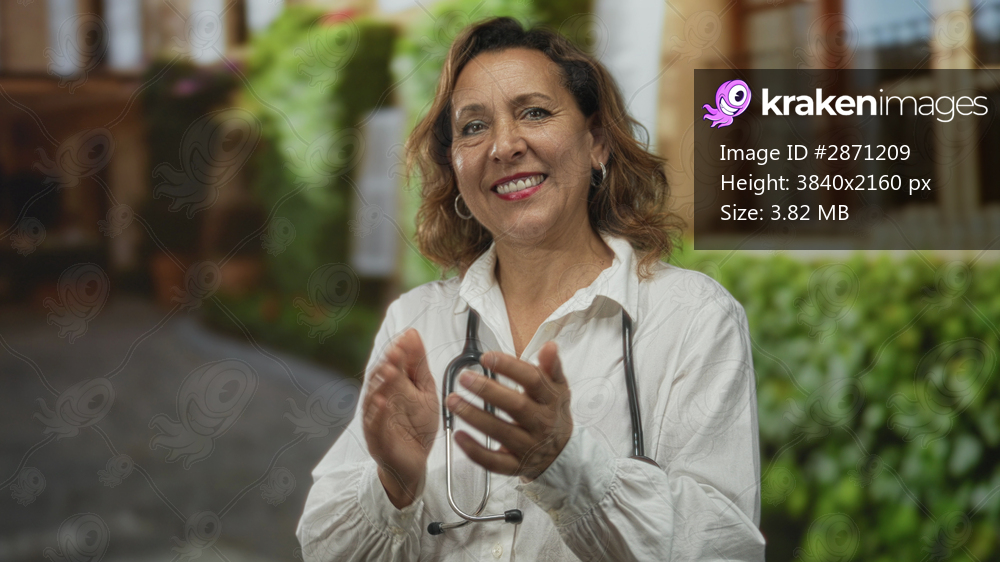 Middleaged woman doctor claps hands with stethoscope in front of building under bright morning sunlight; support.