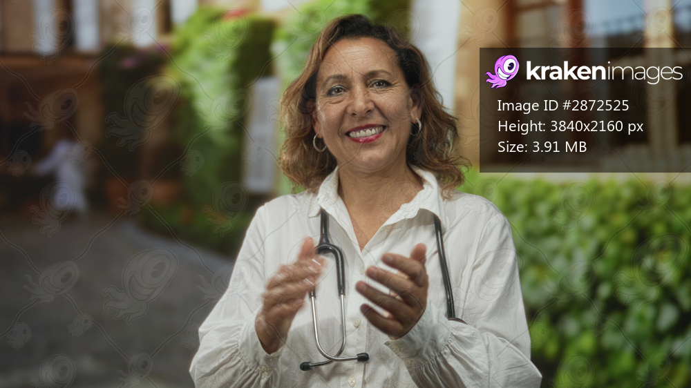 Middleaged woman doctor claps hands with stethoscope in front of building under bright morning sunlight; support.