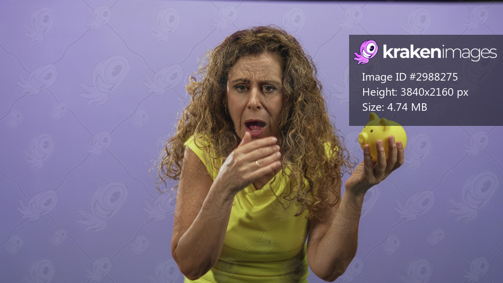 Middleaged woman holding small yellow piggy bank pinching nose with hand in studio set; financial anxiety disgust.