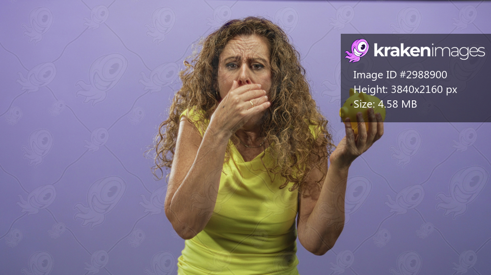 Middleaged woman holding small yellow piggy bank pinching nose with hand in studio set; financial anxiety disgust.
