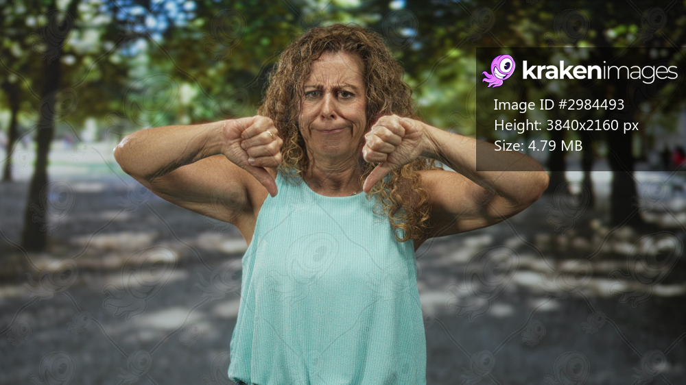 Middleaged woman holding thumbs down and thumbs up with bare forearms on a forest path under trees; indecision.