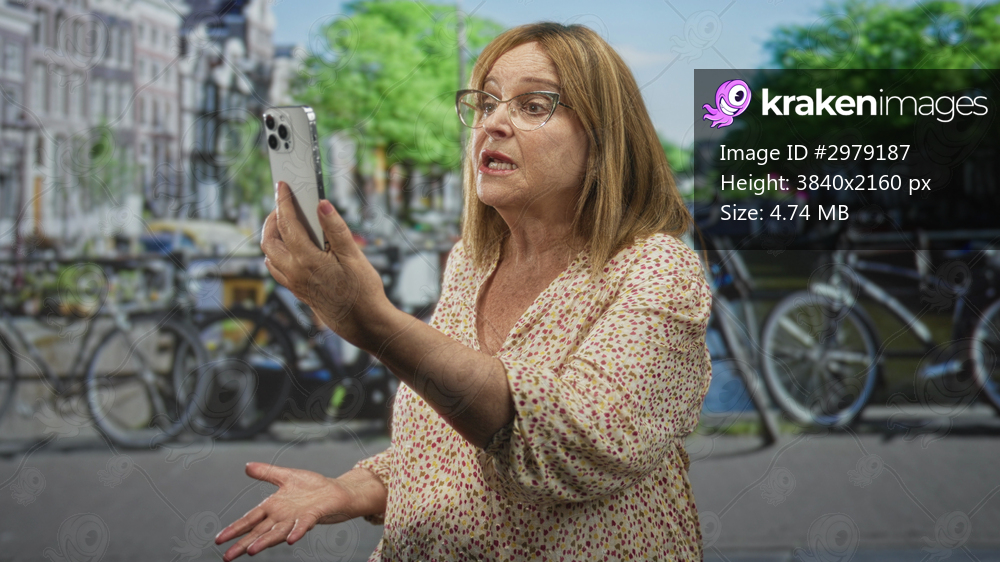 Middleaged woman holds smartphone at arm length, puckering lips and raising hand in a calling gesture on street; affection connection warmth.