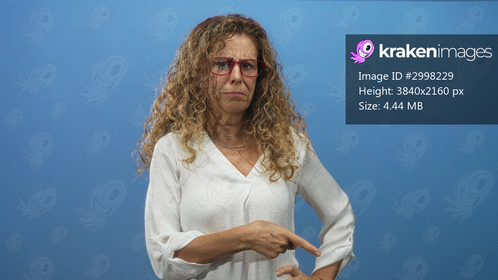 Middleaged woman with red glasses and curly hair points finger to wrist and keeps other hand on hip in studio; disapproval.