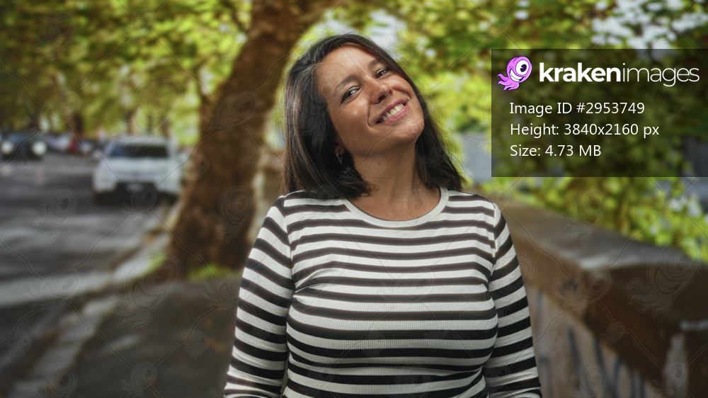 Middleaged woman smiling with face visible, wearing striped shirt on a tree lined street beside a graffiti concrete railing; joy.