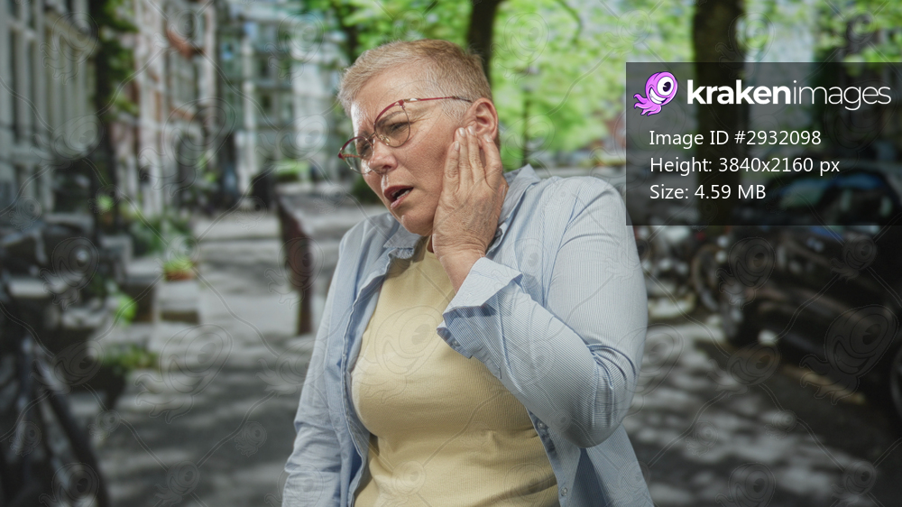 Middleaged woman wearing glasses and a blue shirt holding cheek with hand for toothache on a city street; pain concern.