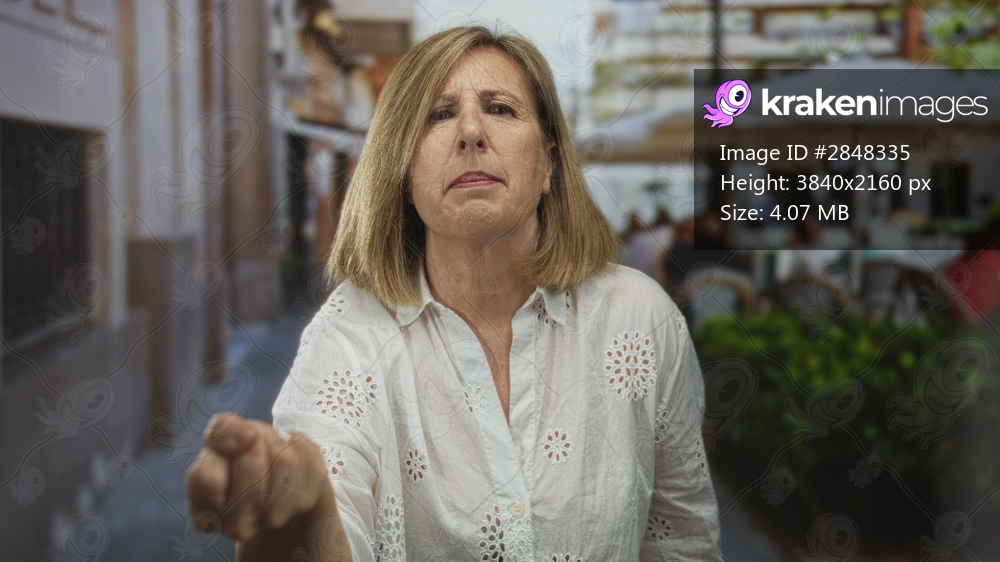 Middleaged woman wearing white blouse beckons with hand on outdoor restaurant terrace in daylight; annoyance.