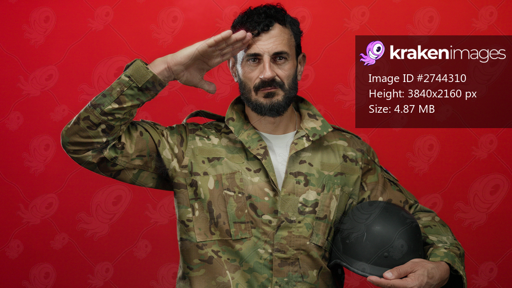 Military man in camouflage uniform gives a salute against a vibrant red background while holding a helmet in his other hand, showcasing dedication and service. - Kraken Images