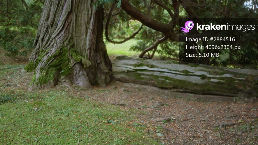 Mossy tree trunk and fallen log with exposed roots in a shallow soft garden background, grassy foreground and twisted branches; background backplate copyspace calm. - Kraken Images