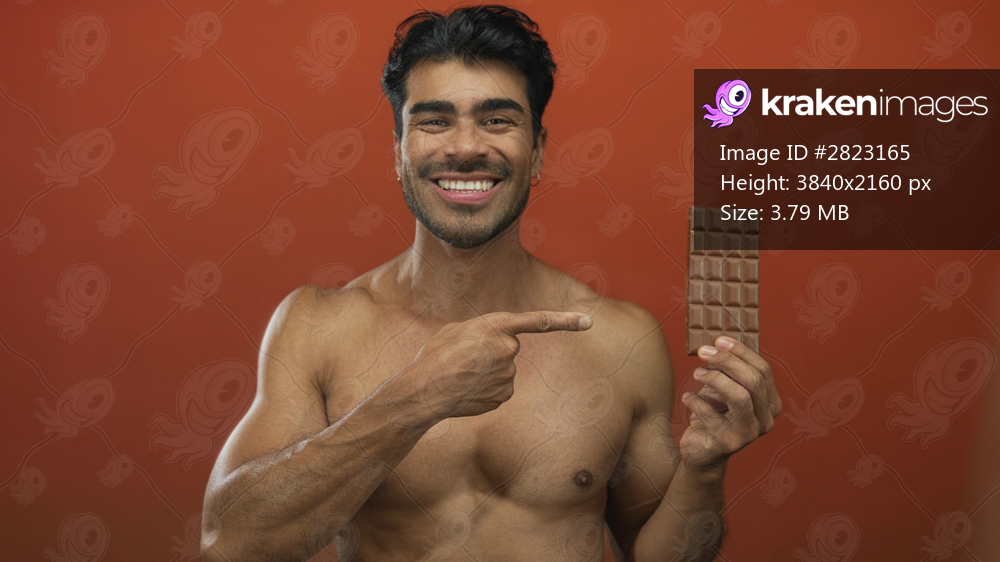 Muscular shirtless man points finger to a chocolate bar while smiling in an orange studio; temptation indulgence.