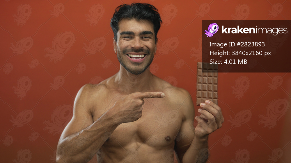 Muscular shirtless man points finger to a chocolate bar while smiling in an orange studio; temptation indulgence.