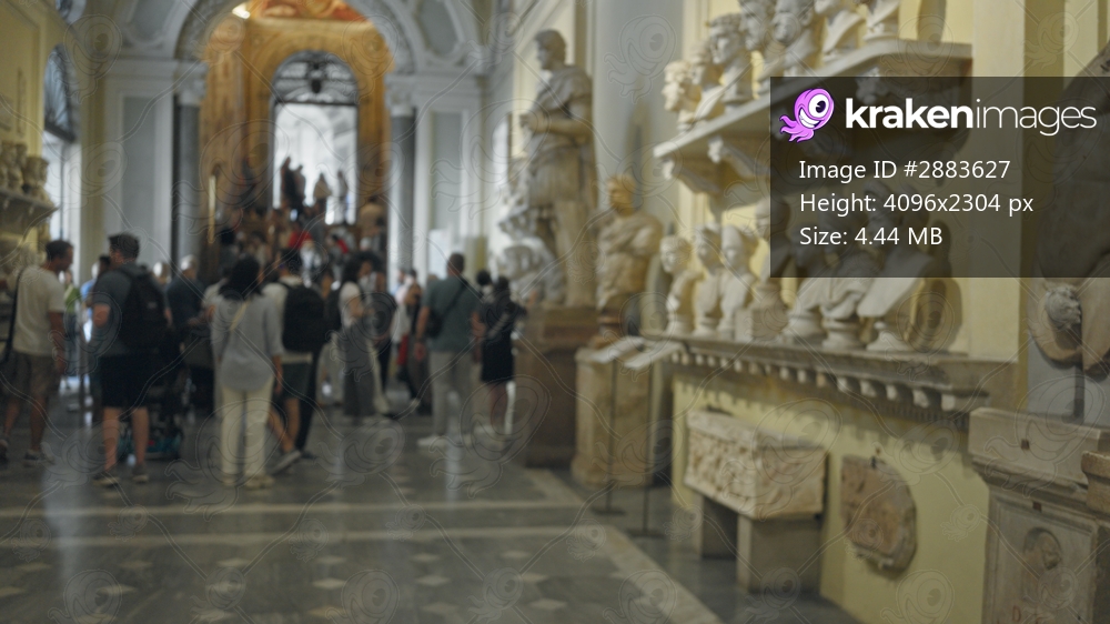 Museum corridor with defocused marble busts and tiled floor, soft blurred bokeh background; background backplate copyspace calm.