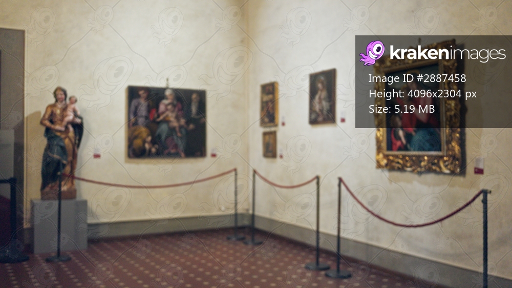 Museum gallery interior with framed paintings, gilded frame and sculpture along a roped perimeter, rendered in soft defocused blur and muted warm tones; background backdrop copyspace calm. - Kraken Images