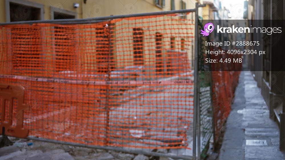 Narrow city alley under construction with orange safety mesh and defocused stone pavement, blurred foreground alley; background.