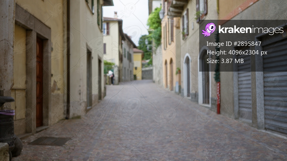 Narrow cobblestone scene with soft bokeh and defocused building facades and muted colors, street; background backdrop copyspace calm.