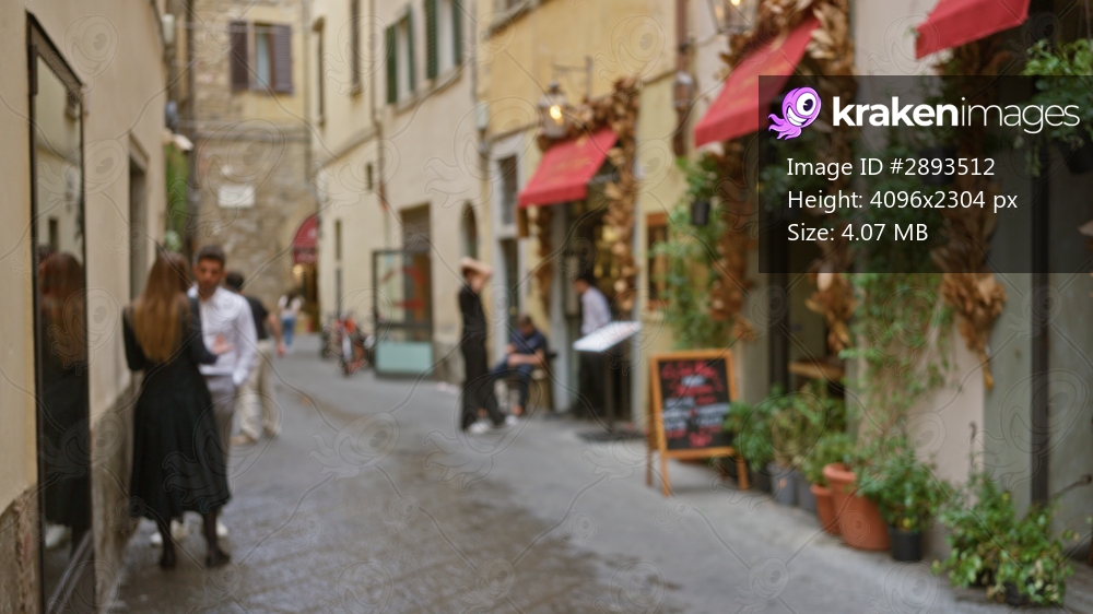 Narrow historic scene with soft blurred bokeh focus on storefronts and potted plants along a cobbled lane, alley; background backdrop copyspace.