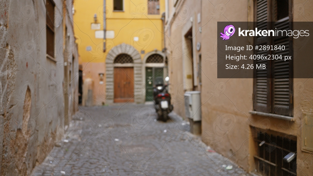 Narrow roman street scene with soft blurred bokeh and shallow defocused depth, warm textured facades and cobblestone street; background backplate copyspace calm. - Kraken Images