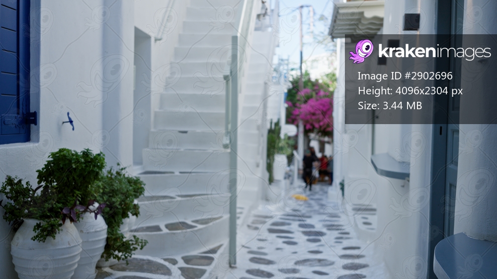 Narrow white alley with shallow bokeh foreground on stairs and potted plants, defocused distant walkway and facade, outdoor; background backdrop copyspace calm. - Kraken Images