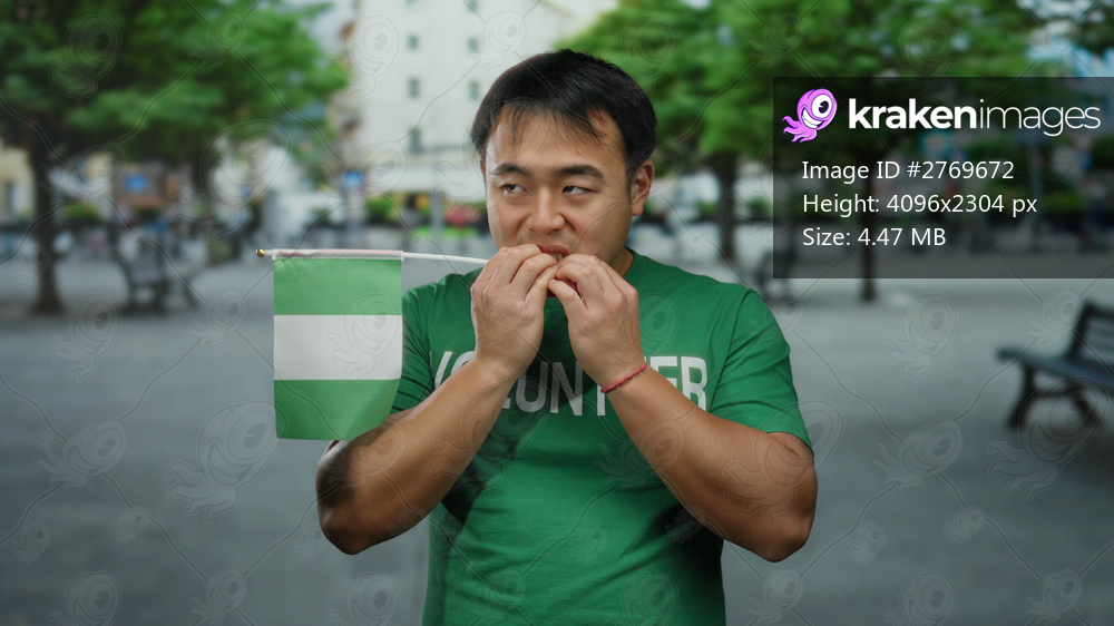 Nervous young man in green volunteer shirt holds nigerian flag outdoors in urban city street reflecting cultural diversity.